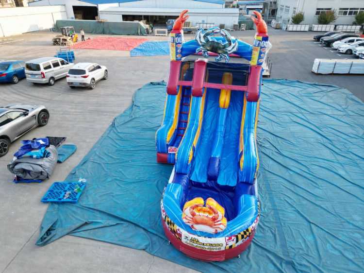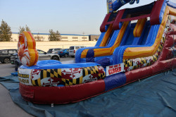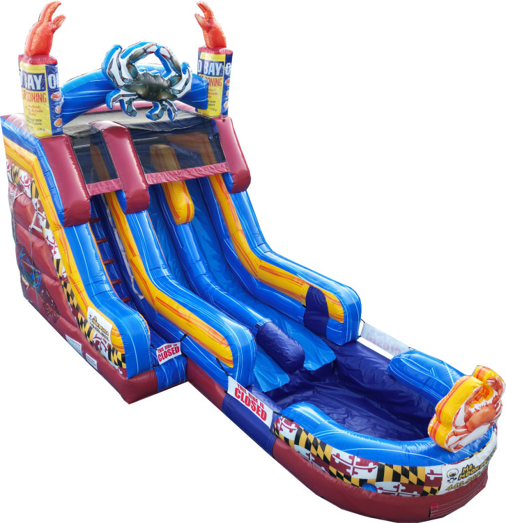 An 18-foot Chesapeake Crab Double Lane Waterslide is a tall, eye-catching inflatable water attraction built for fast, wet fun. With two parallel sliding lanes, it lets two people race side-by-side for a splashy finish, making it ideal for backyard parties, summer events, church picnics, or school field days. The slide’s 18-foot height provides an exciting, safe drop for older kids and teens while the wet surface keeps runs smooth and speedy. Expect a built-in splash pool or landing area to slow sliders safely at the bottom and an entry ramp or steps for easy, controlled climbs. Durable, weather-resistant vinyl and reinforced seams make it suitable for repeated rental use, and bright Chesapeake Crab–themed graphics add playful nautical charm to any setup. Overall, this double-lane waterslide delivers high-energy entertainment, good throughput for groups, and memorable wet-and-wild thrills without requiring specialized supervision beyond standard safety monitoring.