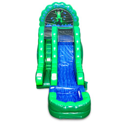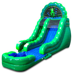 Our New Freaky Frog Splash with Pool can be used as a wet or dry slide. It's a beautiful addition to our best-selling Super Splash Down Line. Our design team changed the look by adding green marble material and a freaky frog theme on the front and side of the unit. A 10' detachable pool is included and attaches in minutes, allowing you to use it wet where kids splash into the pool. Our exclusive air tube system allows you to run both units off one blower. Detach the pool and use it as a dry slide. Be sneaky and buy the freaky and watch your rentals jump!